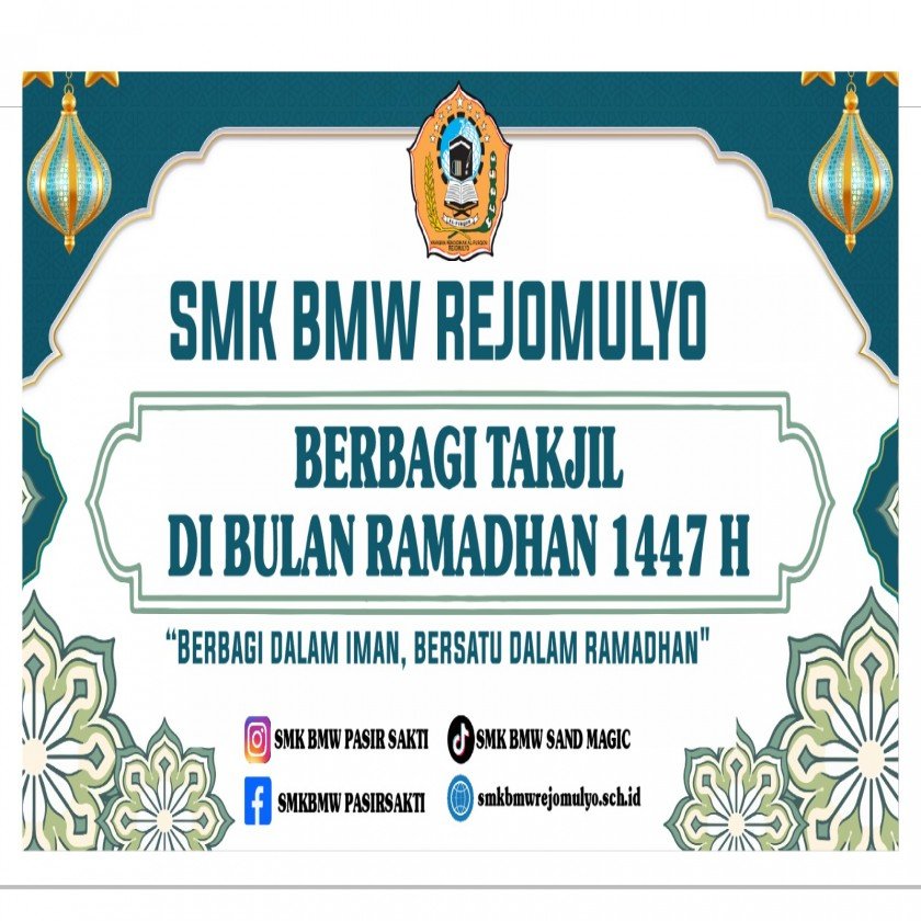 Marhaban Ya Ramadhan 1447 Hijriyah / 2026 Masehi Seluruh keluarga besar SMK BMW Rejomulyo dengan penuh rasa syukur dan kebahagiaan mengucapkan Marhaban Ya Ramadhan. Kami menyambut da