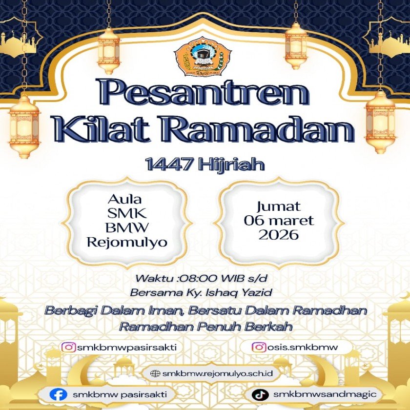 alam rangka meningkatkan keimanan dan ketakwaan kepada Allah SWT serta membentuk karakter peserta didik yang berakhlak mulia, keluarga besar SMK BMW Rejomulyo menyelenggarakan kegiatan Pesantren Kilat Ramadan 1447 Hijriyah / 2026 Masehi. Kegiatan ini menjadi salah satu program pembinaan spiritual bagi seluruh siswa selama bulan suci Ramadan.